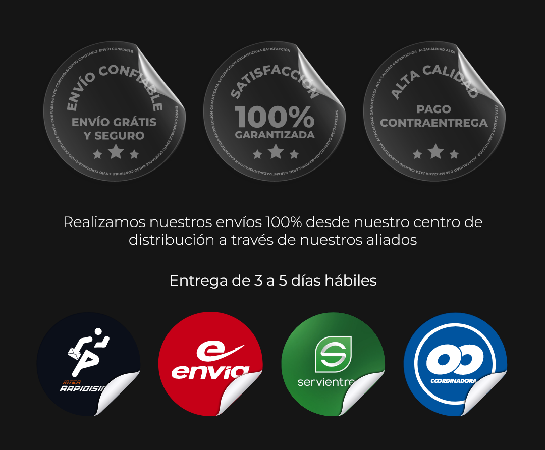 Ofrecemos envío gratuito y pago contra entrega en el 98% del territorio Colombiano, brindándote comodidad y confianza en tus compras. Empresas como Servientrega y mas aliados estratégicos facilitan estos servicios en todo el país. ​